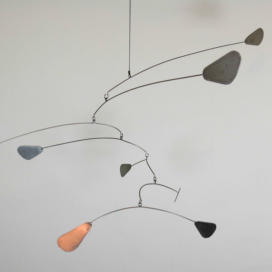 This mobile is made entirely from high grade 316 stainless steel. I cut out each element from stainless steel plate, grind it into shape, then sand it with several grits of sandpaper, then weld it to a stainless steel rod, Then I balance each element in sequence, mark the fulcrum, weld on the loop, heat the end to a red heat and bend the hook. Once all the elements are made, I file the welds by hand, and then sand each piece again to a brushed metal finish. They are very well made, and I like to leave some evidence to the tool marks to show the fabrication process and the ‘realness’ of a handmade work of art.